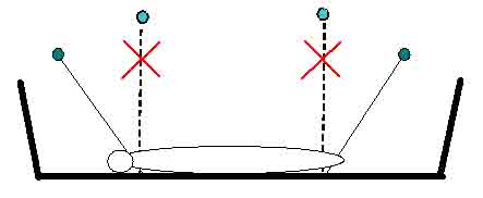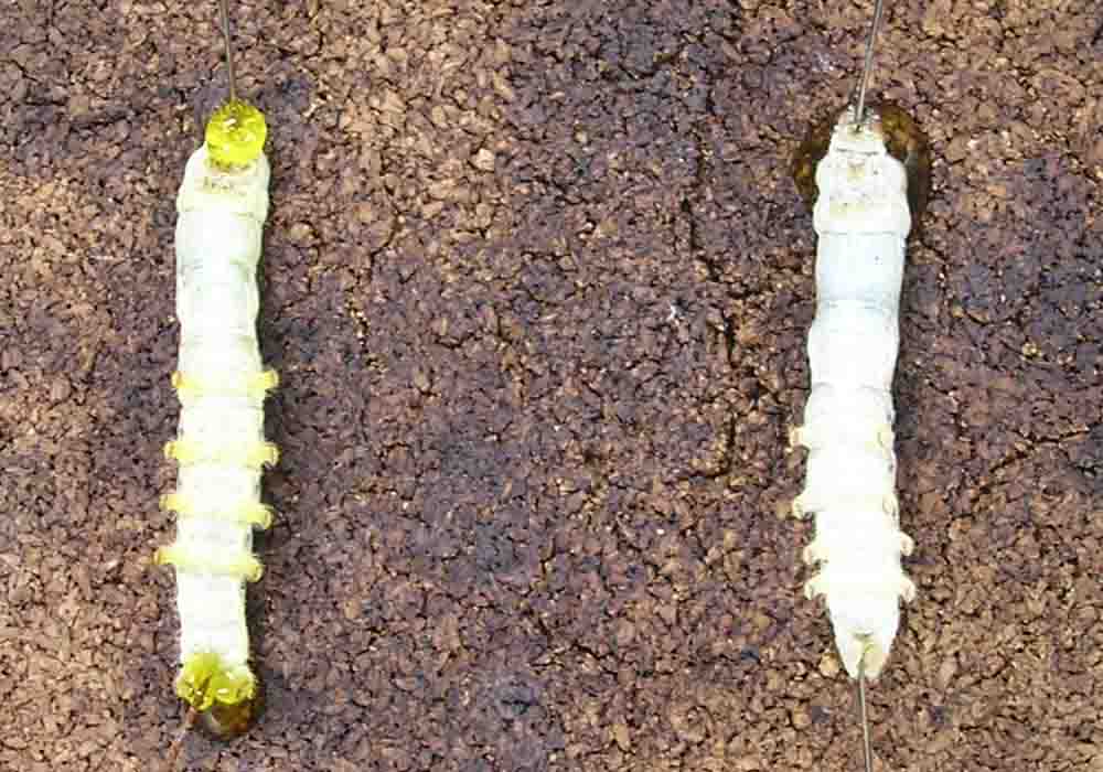2.頭部と胸部の間に虫ピンを刺す。幼虫を引伸ばして尾脚部に虫ピンを斜めに刺す。