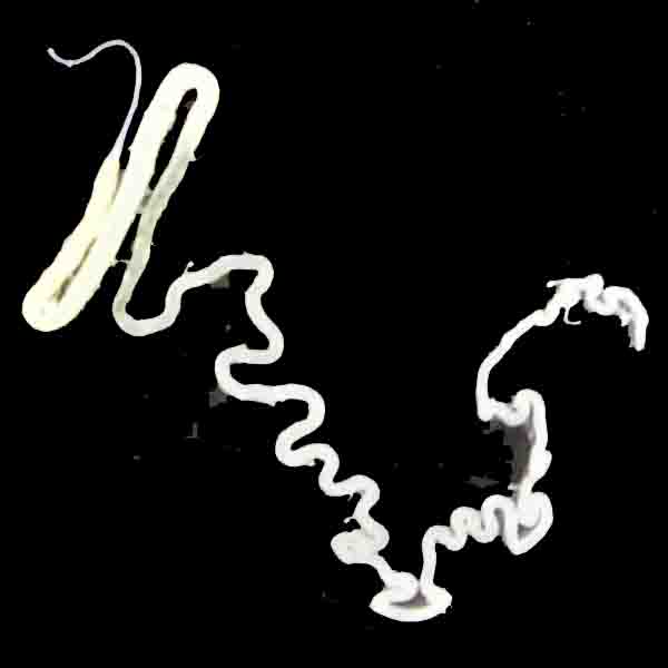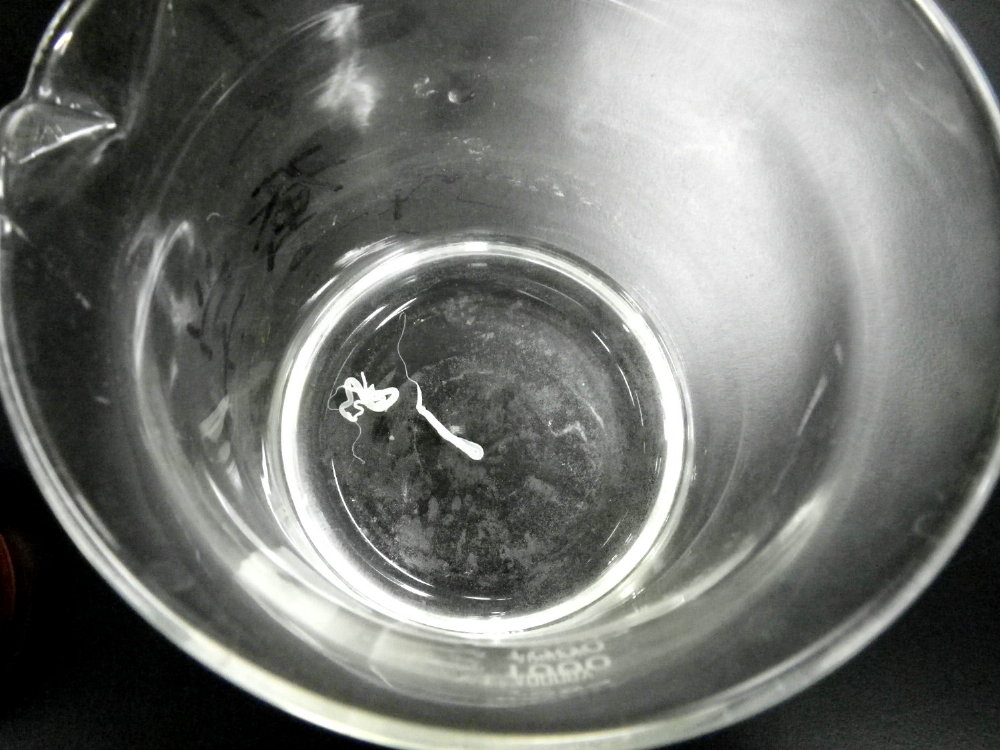 6.中部絹糸腺を取りだし、3%酢酸に1〜10分浸漬する。長く漬けていると硬く脆くなるので、注意する。