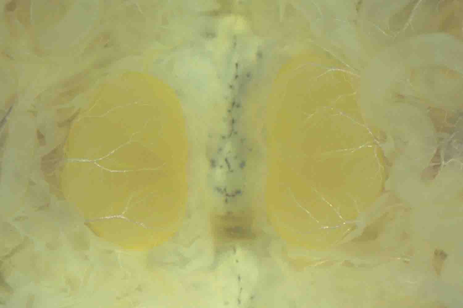 C実体顕微鏡で食道上の脳(小豆色)〜アラタ体(白色:幼若ホルモンを分泌する器官)を