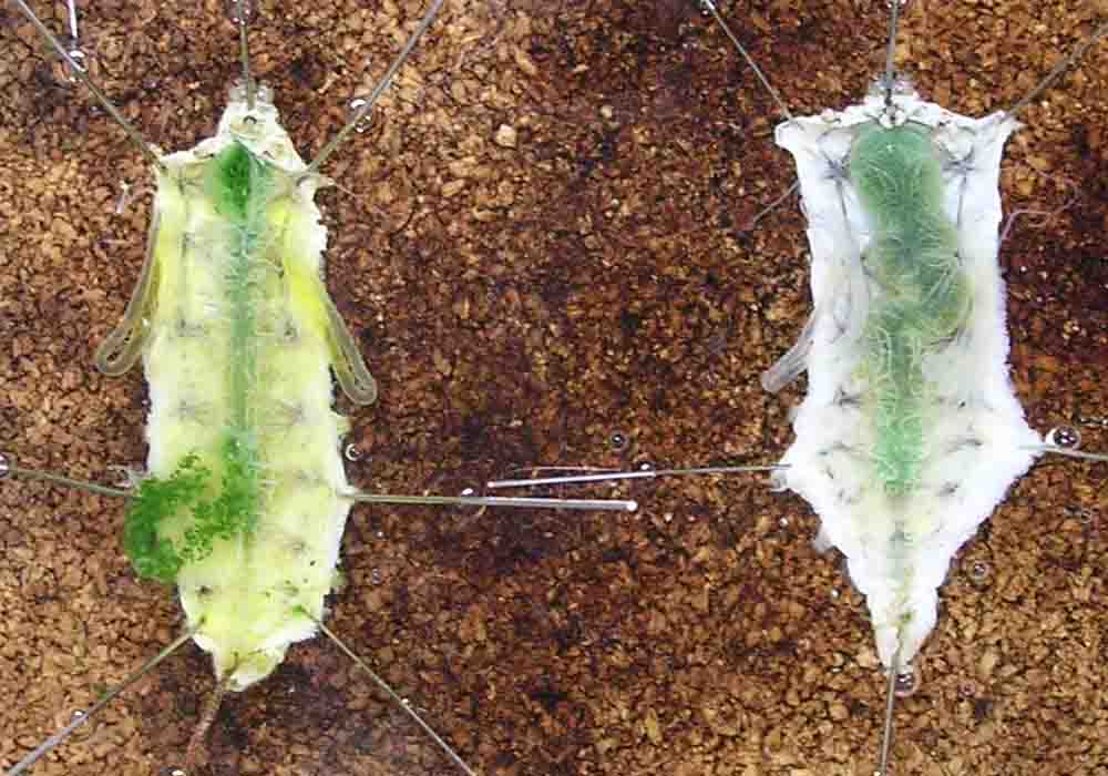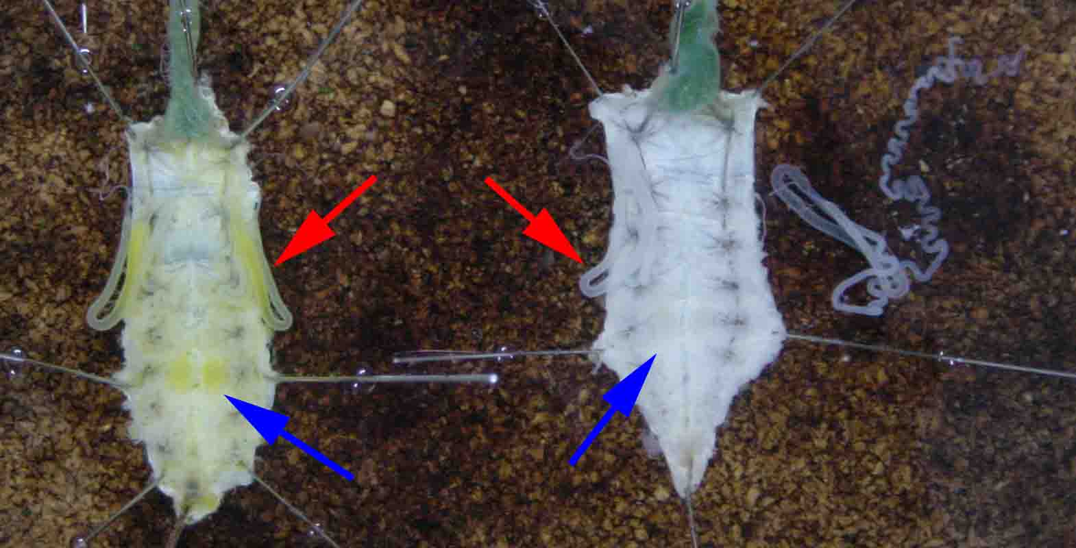 精巣(青矢印)と絹糸腺(赤矢印) 左:黄血蚕、右:白血蚕