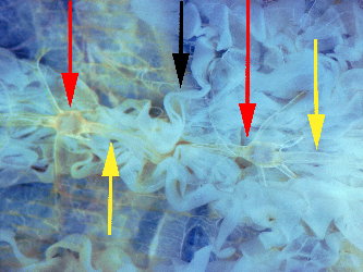 赤矢印:神経球、黄色矢印:神経索、黒矢印:脂肪体