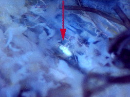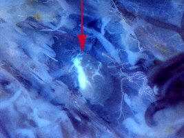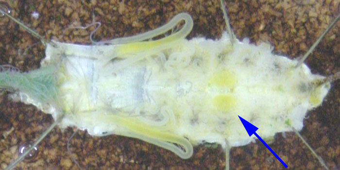 G実体顕微鏡で腹部第5節(↑印)にある生殖巣(半透明)を観察(スケッチ)する。