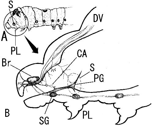 | A:幼虫、B:頭胸部、 Br:脳、SG:食道下神経節 CA:アラタ体、PG:前胸腺、S:第1気門、DV:背脈管 PL:第1胸脚、FG:前額神経球 |