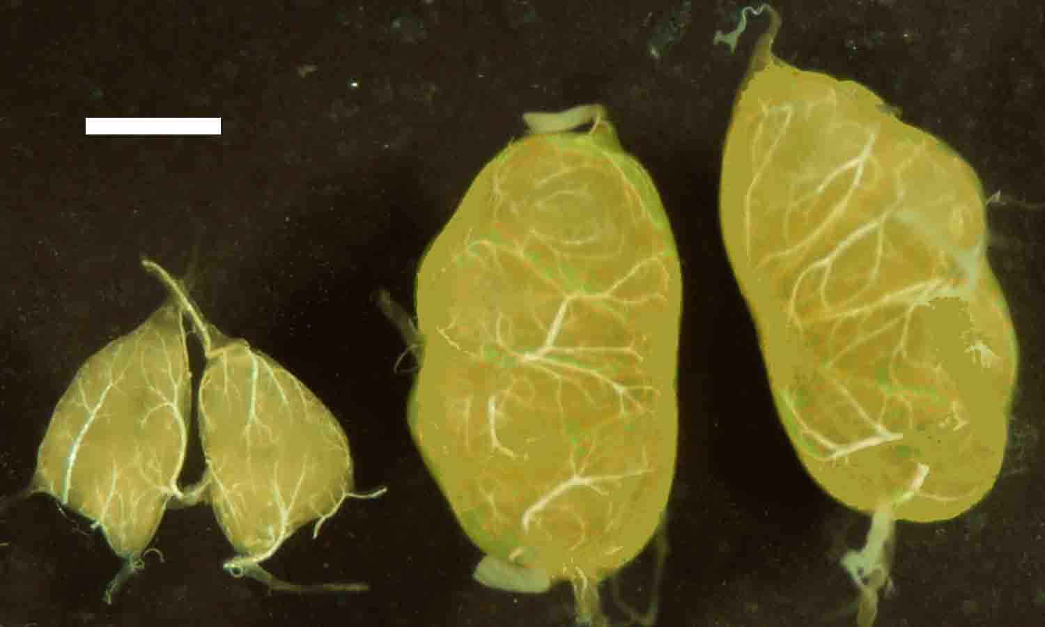 | 黄血蚕を使うと絹糸腺や生殖巣が観察しやすい。 | |