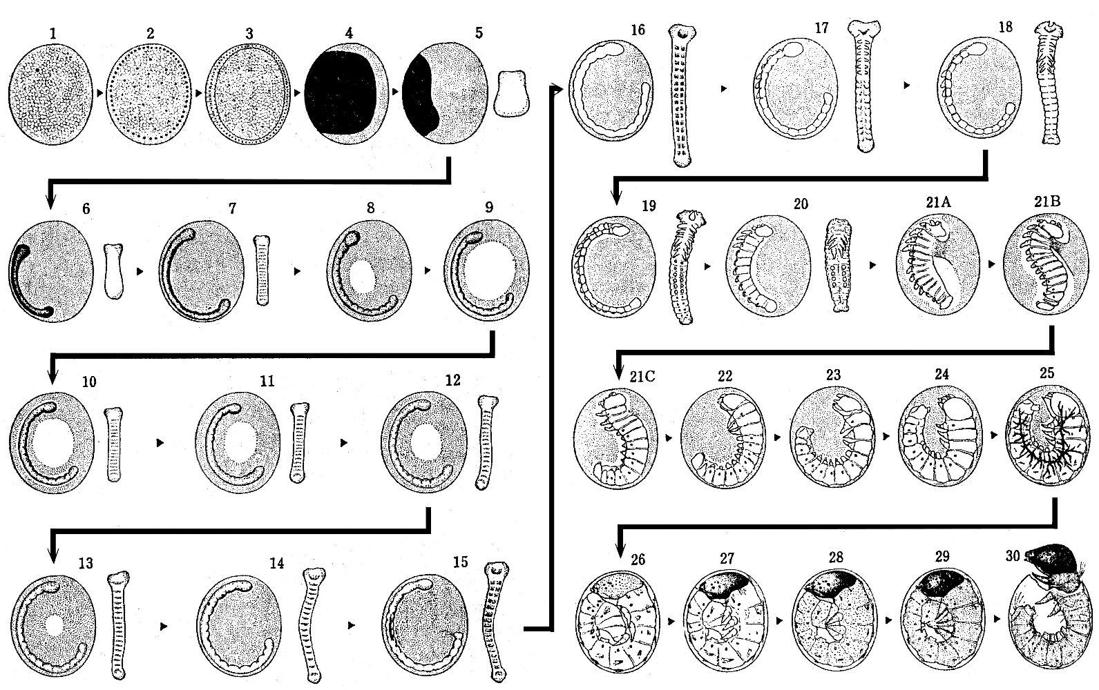参考論文:高見丈夫・北沢敏男 家蚕の胚発生段階表T. 蚕糸試験場彙報.75.1-31(1960)