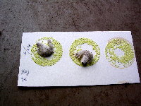 | 5. | 交尾した雌蛾の腹を押し,蛾尿を出させる。 卵に蛾尿がついてもほとんど影響はないが,洗う手間や調査の邪魔になる。 |