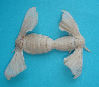 | 4. | 交尾した雌雄を分ける(割愛)。雌雄を引っ張って分けるのではなく、雌雄を捩じるように分けると容易に分けられる。 割愛しないと延々と交尾し,蛾が疲労し,産卵が不良となる。 |