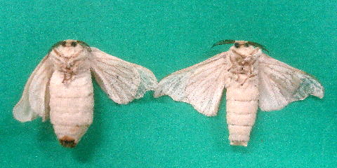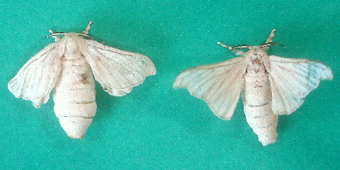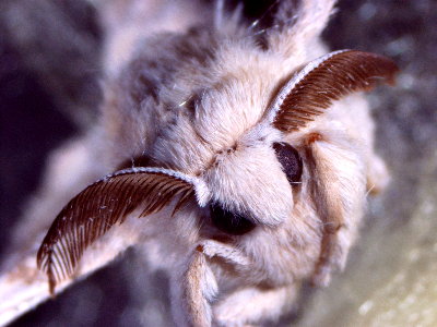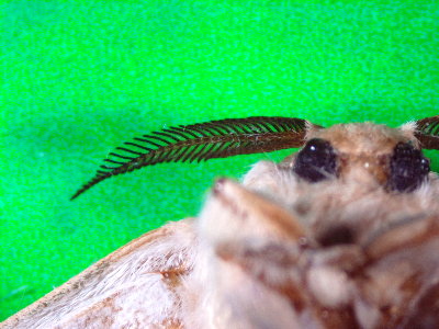 | フェロモンを受容するため、雄蛾(右図)の触角は雌蛾(左図)の触角より大きい | |