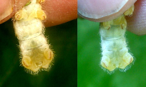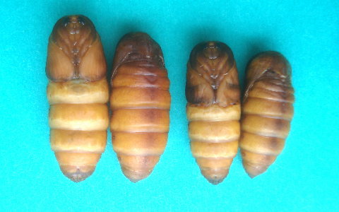 | ♀(左)は♂(右)に比べて卵を作るので一回り大きい。 腹側尾部を見ると、若干違うので雌雄を化蛹後から羽化直前まで判別できます。 |