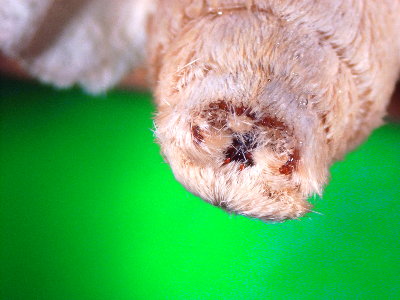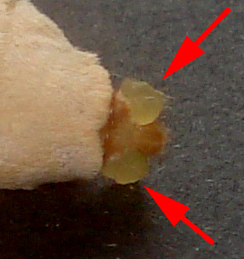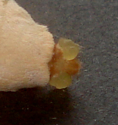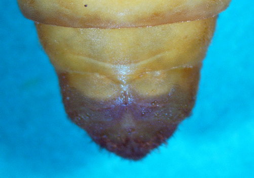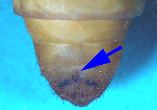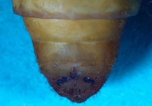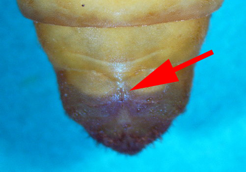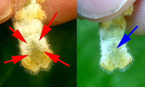 脱皮直後から1日位の間、 白い点のように見えます。 餌を食べ、皮膚の下に脂肪がつくと 判別できなくなります。 鱗翅目の幼虫はこの腺によって 雌雄を判別することができます。。 |