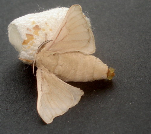 | カイコの雌蛾は尾部の誘引腺(赤矢印)から性フェロモンを放出して、雄蛾の交美尾行動を刺激します。 | |