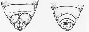 左側が♀、右側が♂ 雌は体内に300〜600個の卵を有しているので雄に比べて一回り大きい。 |
