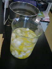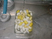 (5)火を止めて、冷える前に煮た繭ごと化粧瓶に移すと雑菌が入らないので腐りにくいようですが、くれぐれも火傷しないように!