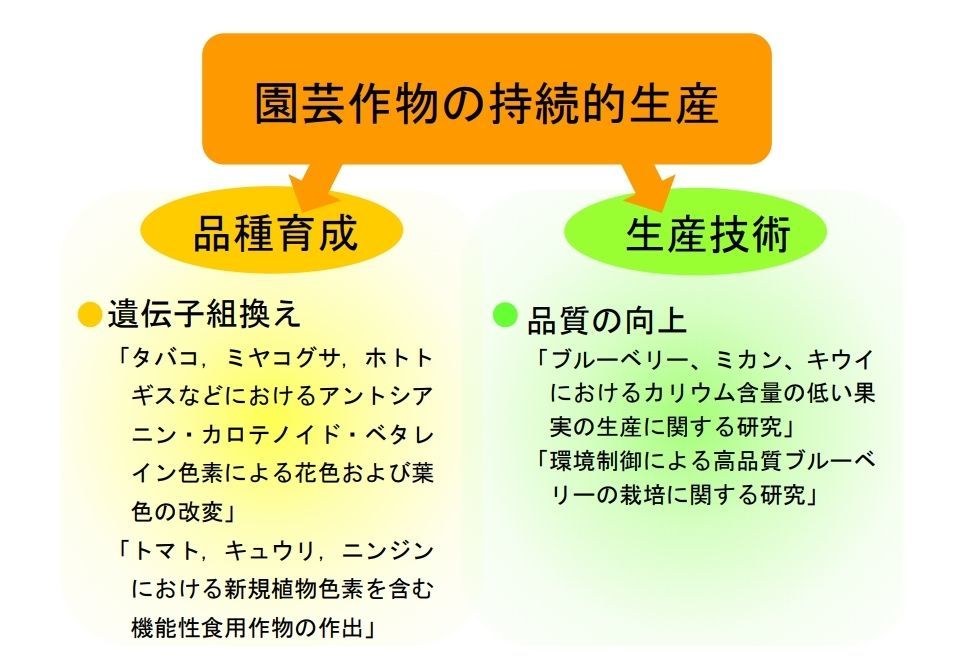 私たちは、施設園芸と植物組織培養の研究を中心に、様々な園芸作物における発芽から生長、開花、結実、老化までの幅広い領域について研究し、園芸作物の持続的生産に貢献します。