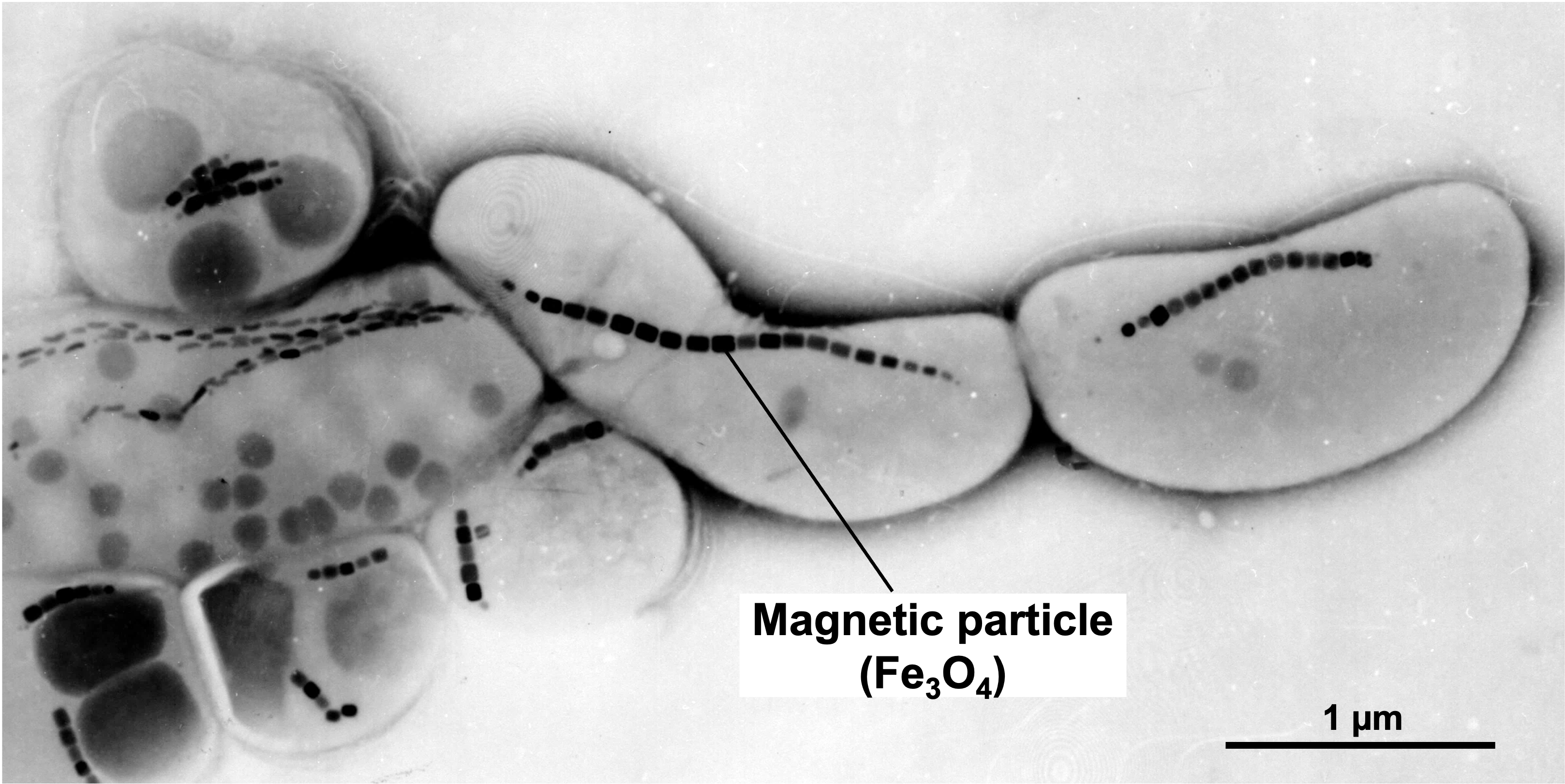 Magnetotactic bacteria are microorganisms that precisely synthesize magnetic particles within their cells (Fig. 1). Magnetotactic bacteria are anaerobic bacteria that utilize intracellular magnetic particles as biological compasses, exhibiting unique behavior called magnetotaxis by sensing Earth's magnetic field to swim toward sediment layers with low oxygen concentrations. They are distributed in aquatic environments worldwide and selectively uptake trace iron ions from the environment to synthesize magnetite (Fe₃O₄) magnetic particles with a diameter of approximately 40 nm. Depending on the bacterial species, complex and precise morphologies such as cubic, octahedral, and bullet-shaped forms are controlled, which are difficult to achieve through chemical synthesis methods.