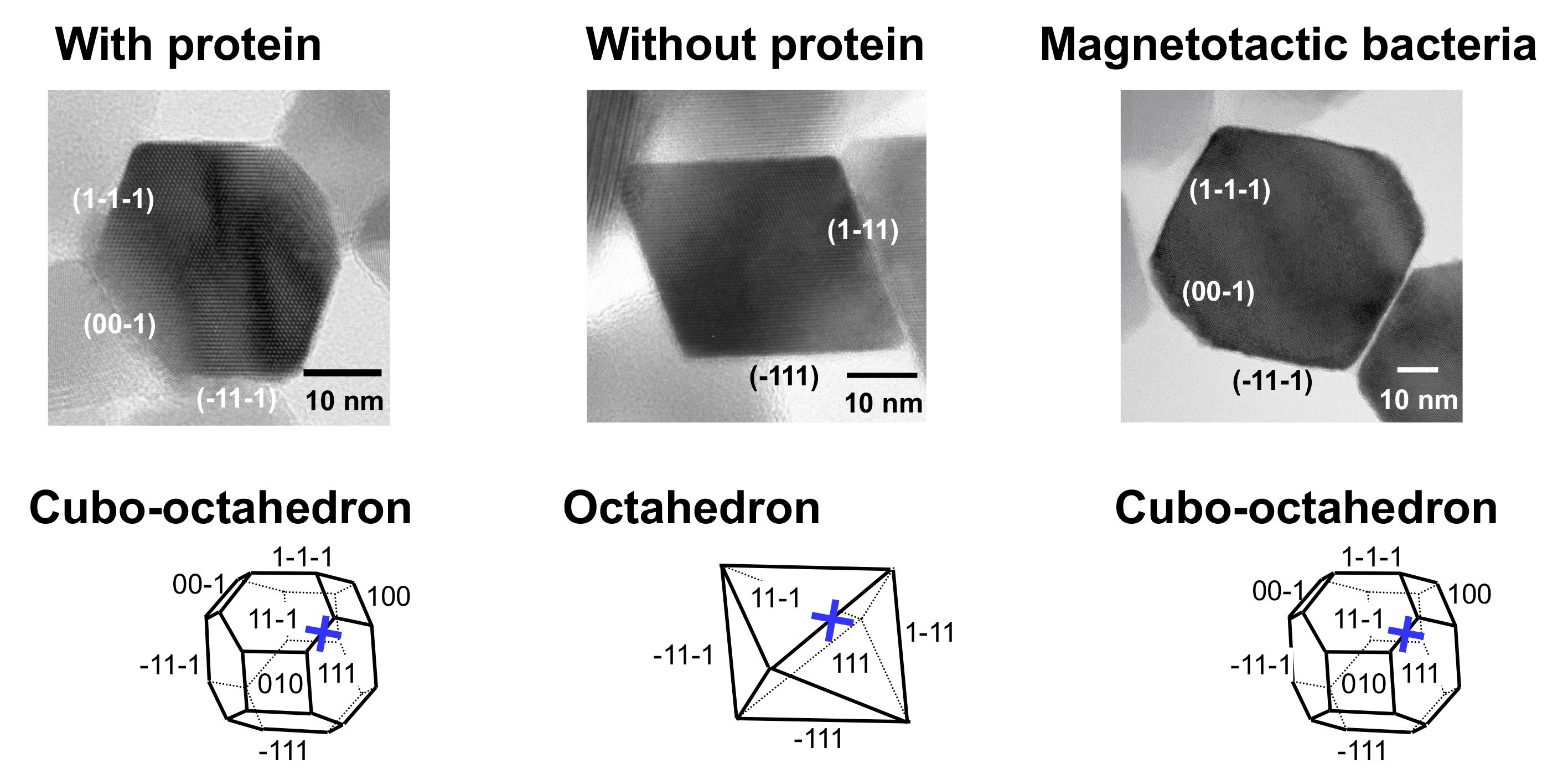 Magnetic particles are functional materials with wide-ranging applications from medical fields such as magnetic hyperthermia and MRI contrast agents to magnetic recording media. However, conventional chemical synthesis methods face challenges including difficulty in precise morphological control and high environmental impact. Our laboratory develops design and manufacturing technologies for magnetic particles tailored to specific applications by utilizing the biological control systems of magnetotactic bacteria. By incorporating morphology-controlling proteins isolated from magnetotactic bacteria into chemical synthesis, we achieved the first successful morphological control of magnetic particles using biomolecules (Fig. 3). This innovative biomimetic synthesis method is expected to enable the creation of magnetic materials with complex structures and superior magnetic properties impossible with conventional methods.