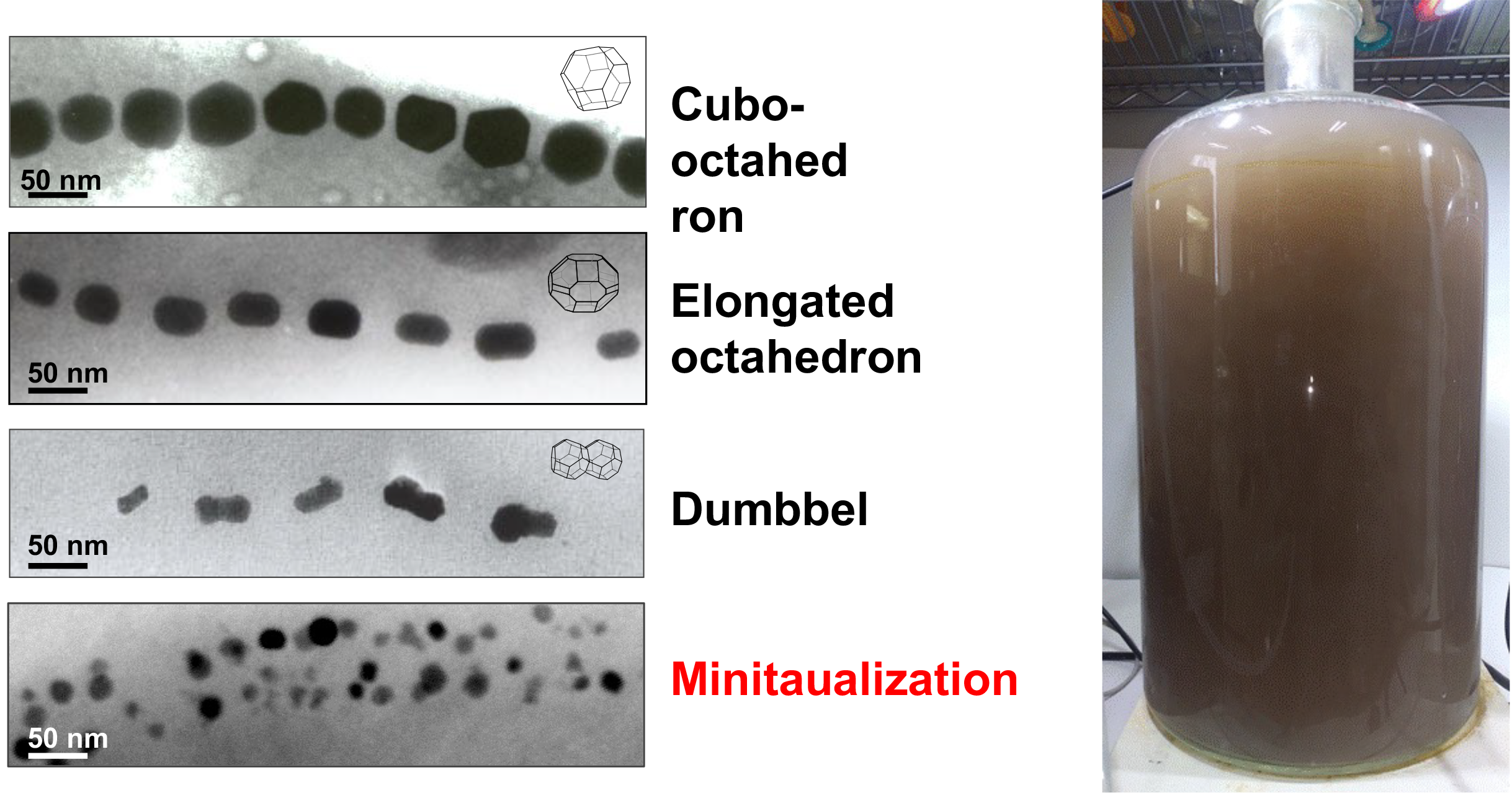 Through identification and functional elucidation of magnetic particle synthesis gene clusters, precise control of cellular magnetic particle synthesis capability became possible through genetic modification of magnetotactic bacteria. Through gene expression regulation and mutant strain construction, we have successfully controlled the synthesis of magnetic particles with diverse sizes and morphologies (truncated octahedron, elongated octahedron, bullet-shaped, dumbbell-shaped, etc.) (Fig. 4). We have also achieved production of magnetic particles with complex morphologies and anisotropy impossible through chemical synthesis. Furthermore, we have successfully increased magnetic particle content several-fold compared to wild-type strains, establishing the foundation for mass production technology toward practical applications. These technologies have enabled the creation of custom-designed magnetic particles.
