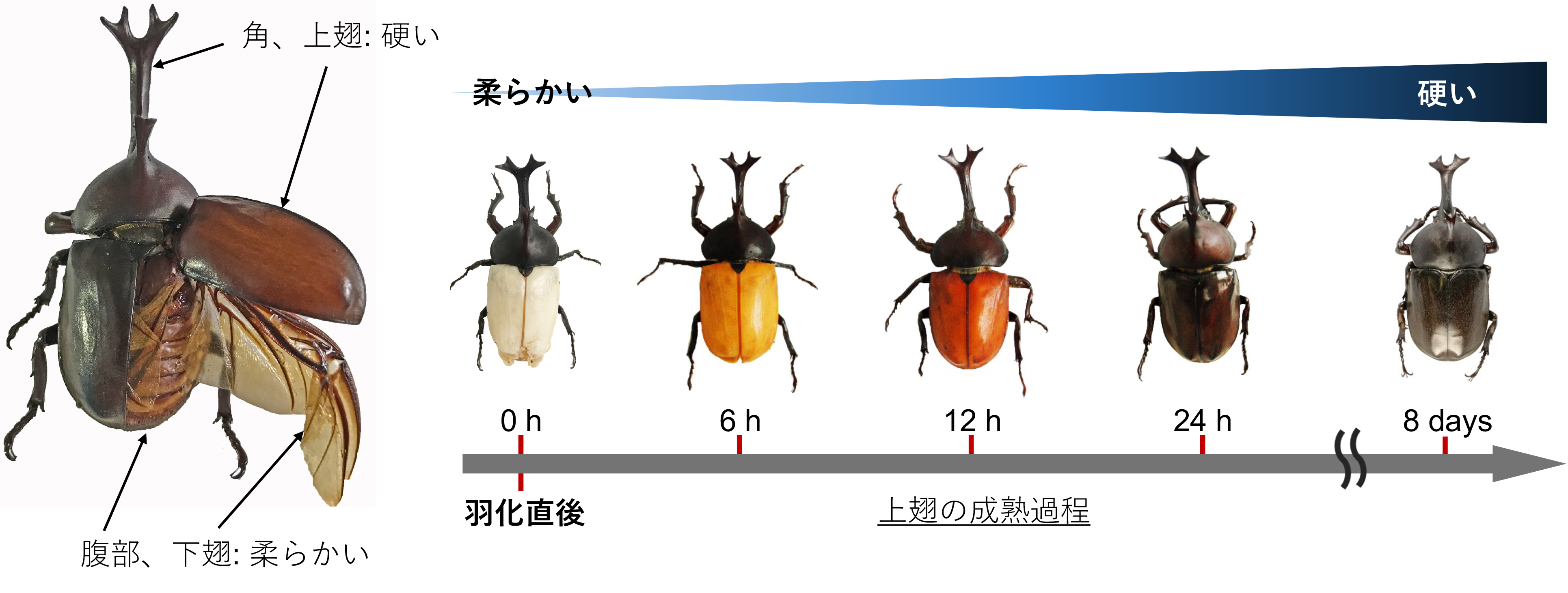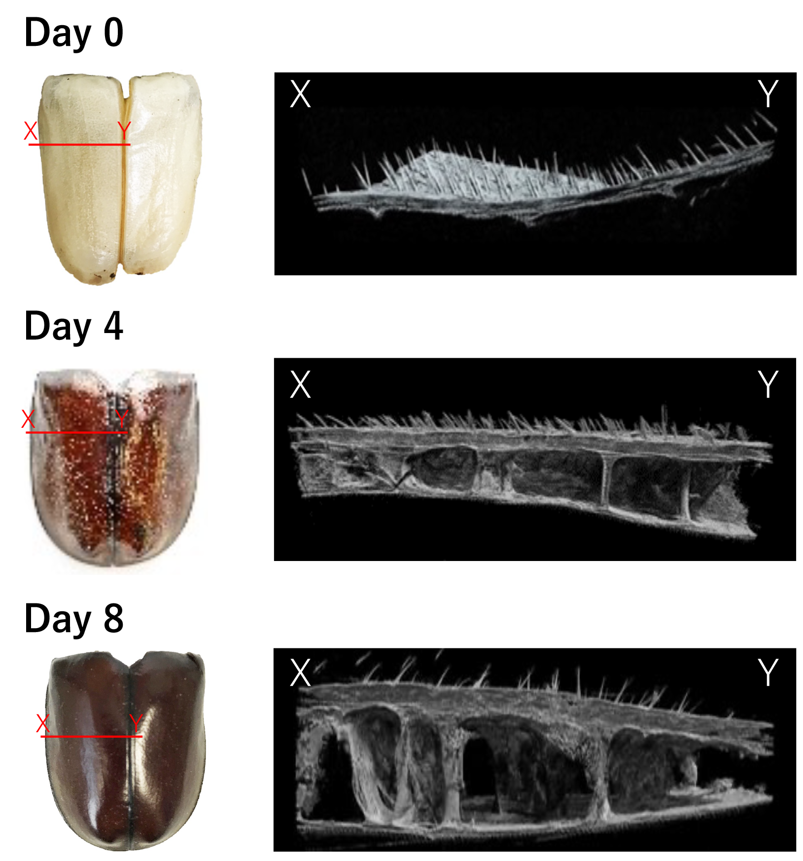 カブトムシの背中を覆う硬い翅は、上翅(じょうし)と呼ばれます。蛹から羽化した直後のカブトムシの上翅は、白く柔らかいですが、数日のうちに急激に黒くなると同時に硬くなります。羽化直後から、4日、8日経過後の上翅をμ-CTスキャンにより解析しました(動画)。羽化直後の上翅は、一層のシート状構造を持つのに対し、時間経過に伴い、二層に分離する様子と柱の形成、各層が厚くなる様子が観察されました。上翅の成熟過程では、わずかな時間において、急激な構造の変化が起こることを明らかにしました。