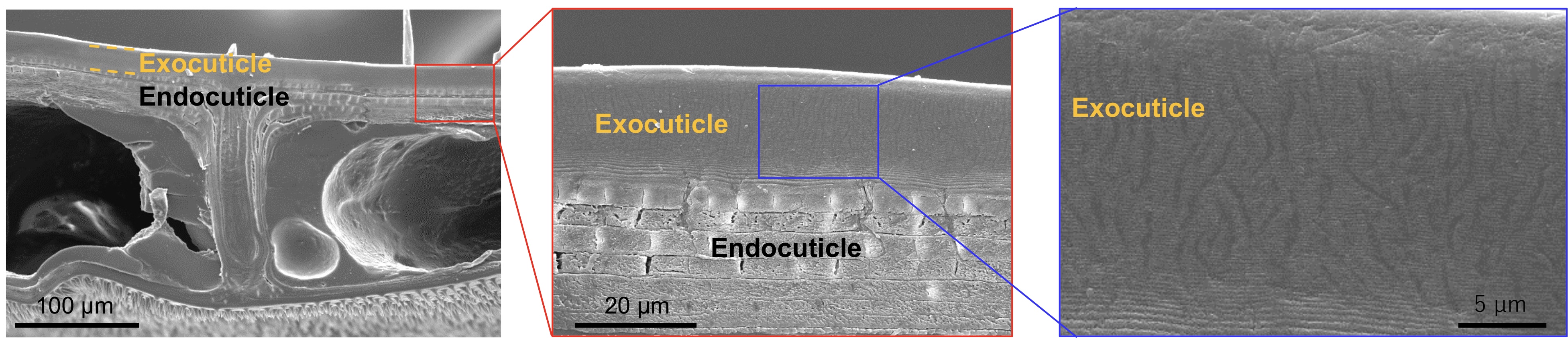 カブトムシの雄の角は、縄張り争いなどにおける武器として機能することから非常に硬い一方で、同じ成分から成る足の関節部などは柔軟性に富んだ性質を持っています。また、蛹から羽化したばかりの成虫の翅は、わずかな時間において急速に硬化し、強度が格段に向上します。このように一見全く異なる性質を示す外骨格ですが、その主成分はいずれもキチンとタンパク質です。キチンとタンパク質が分子レベルで結合することで、多様な構造や機械特性を有するボディパーツが作られていると考えられています。これまでに、強度等の機械特性が異なる甲虫の外骨格における微細構造の違いを明らかにしました(図2)。