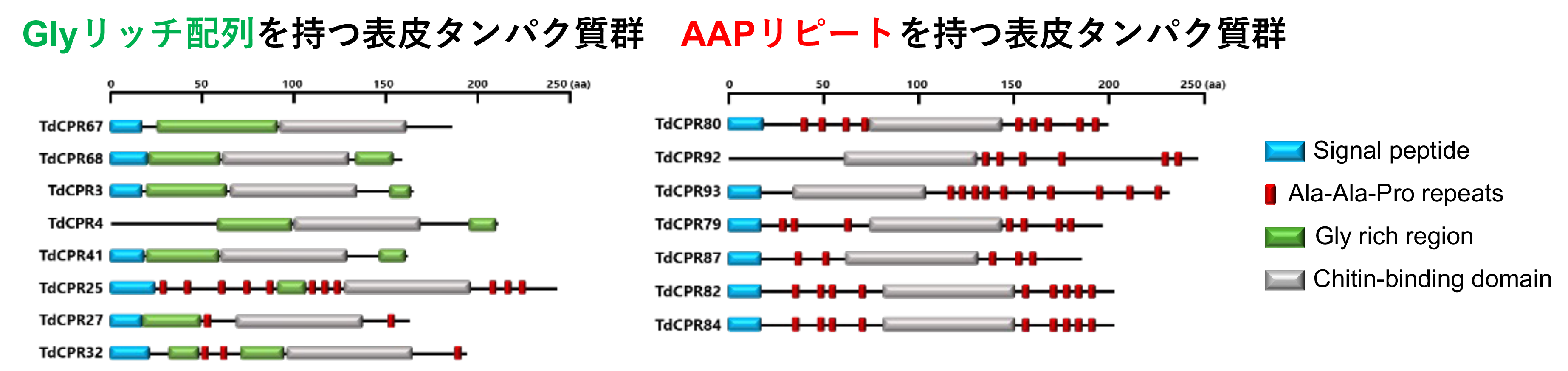 甲虫外骨格を構成するタンパク質は表皮タンパク質と呼ばれ、表皮の形成に重要な役割をすることが知られています。羽化直後の白く柔らかい未成熟の表皮と、黒く硬くなった成熟した表皮の比較プロテオーム解析を行うことで、表皮形成の各過程で発現するタンパク質を明らかにしました(図3)。また、それぞれの過程において、アミノ酸配列において異なる特徴を有するタンパク質群が発現していることを明らかにしました。