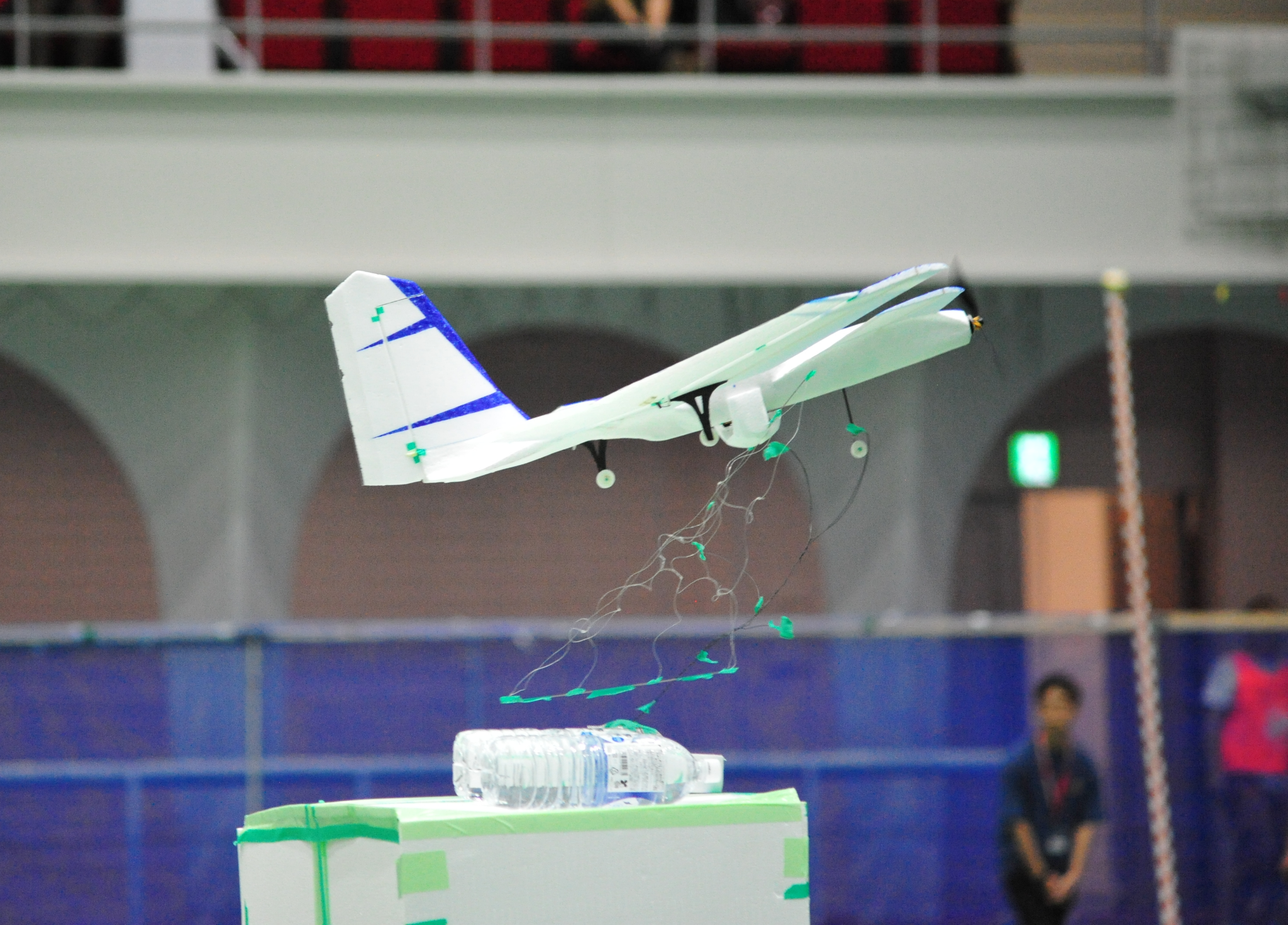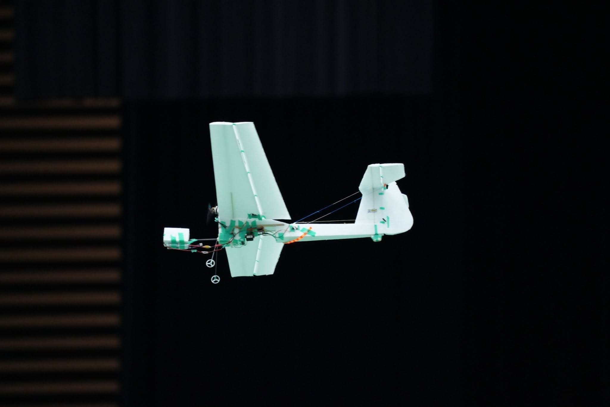 従来グライダーの試験は地上からの手投げで行っていたが、体育館の天井ギリギリから行うことを可能にした。