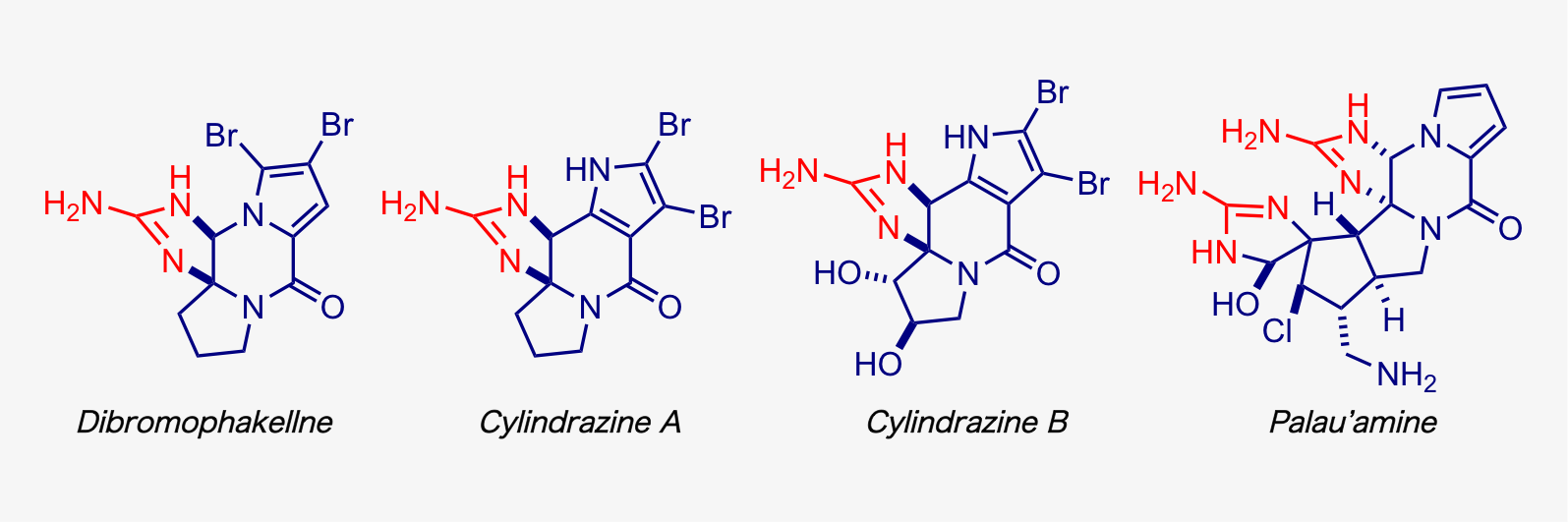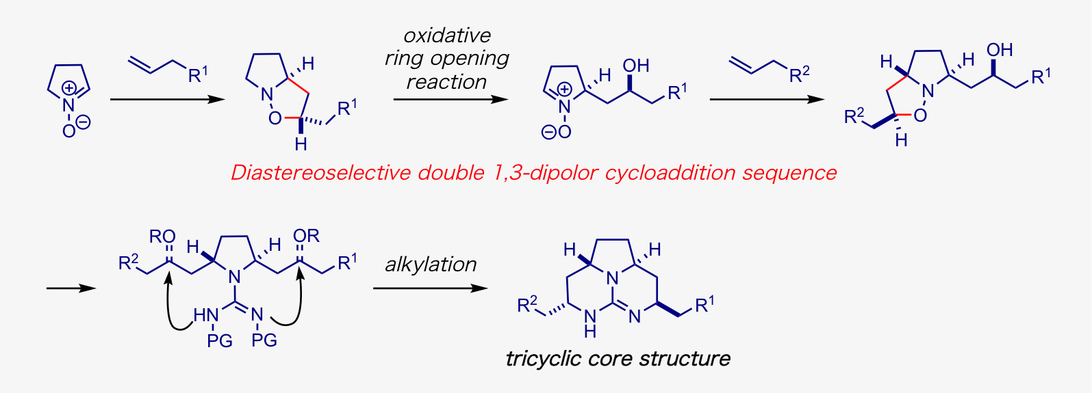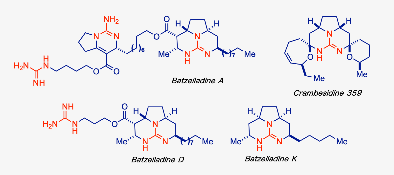 海産多環性グアニジン系天然物、crambescidin類及びbatzelladine 類は、強力な抗ウィルス活性、抗菌活性、抗腫瘍活性など様々な生理活性を示すことが報告されている。当研究室では、その興味深い生理活性と、ユニークな骨格を有する一連の多環性グアニジン系天然物の全合成研究を行っている。これまでに連続的な1,3-双極子付加環化反応によって得られる二置換ピロリジン化合物を共通合成鍵中間体することで、Batzelladine A、D、K及びCrambesidine 359の全合成を達成している。