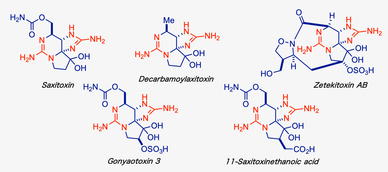 貝毒サキシトキシン(STX)は、フグ毒テトロドトキシンと同様、強力な電位依存性Naチャネル阻害活性を示すグアニジンアルカロイドである。STXには50種を超える多様な類縁体が存在し、いずれも三環性ビスグアニジン骨格を持つ。Naチャネルは骨格筋、心筋および神経細胞に広く分布する膜タンパクでこれらの活動電位の発生に重要な役割を果たしていることが知られている。Naチャネルには9種のサブタイプが存在し、これらに対する選択的な阻害剤は、NaVCh機能解析ツールや抗疼痛薬のリードとなる。長澤研究室では、サキシトキシン骨格を基盤とするサブタイプ選択的な阻害剤の開発を志向し、STX類の合成研究を行っており、これまでにサキシトキシン (STX)、do-STX、dc-STXそして最も官能基化された類縁体の1つであるGonyautoxin 3(GTX3)の全合成を達成した。