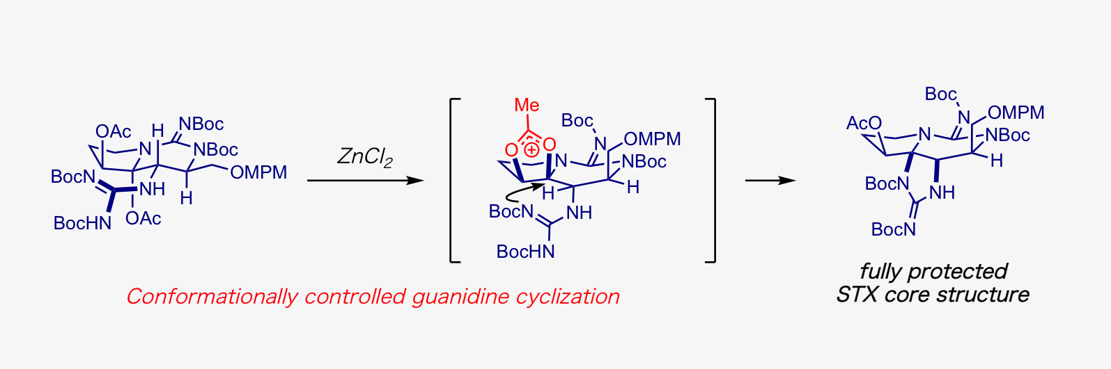 また、塩化亜鉛を用いたアセチル基の隣接機関与による構造変化を伴う環化反応を開発し、STX類縁体を合成するための有用合成中間体の開発に成功している。