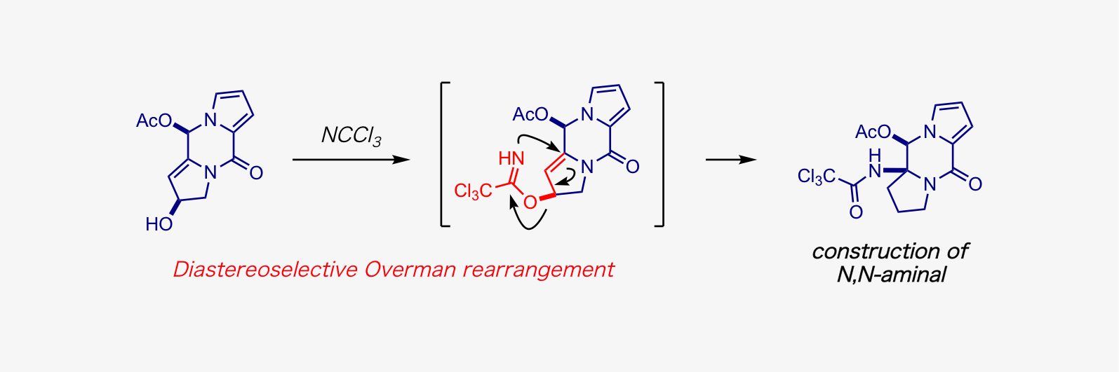 長澤研究室では、温和な条件下進行するジアステレオ選択的Overman転位反応により、四級不斉N,N-アミナール構造の構築に成功している。