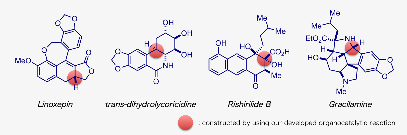 また、開発した有機触媒反応を基盤とした有用生理活性物質の効率的な合成手法の開発も行っており、これまでにlinoxepin、trans-dihydrolycoricidine、rishirilide B、gracilamineなどの不斉全合成に成功している。