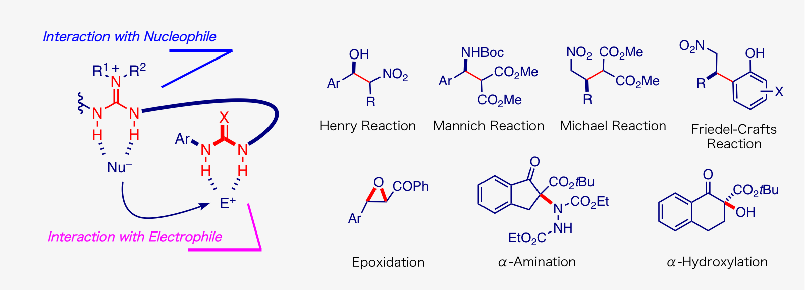 グアニジン–(チオ)ウレア触媒は、グアニジン及び(チオ)ウレアの二つの官能基が光学活性なアルキル鎖で連結された鎖状構造を有する有機触媒である。本触媒は、光学活性なアルキル鎖で繋がれた両官能基が協調的に反応基質(求核剤・求電子剤)を認識し、基質間の活性化及び近接効果を誘起することで、従来の手法では困難な触媒的不斉反応が実現可能である。これまでに不斉マンニッヒ反応、ヘンリー反応やフリーデル·クラフツ反応などの開発に成功している。