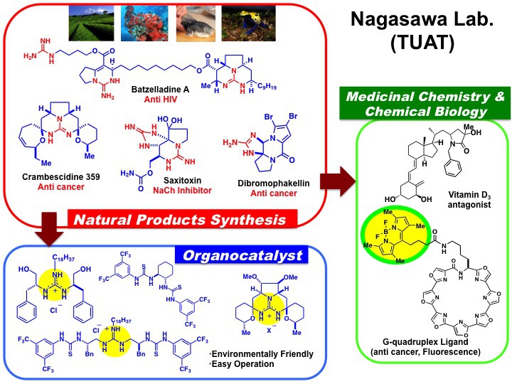 有機触媒は、環境調和型の触媒として近年非常に注目されている。長澤研究室では、新規有機触媒の開発、開発した触媒を用いた不斉反応や新規反応の開発を行っている。特に近年では、水素結合能を有するグアニジン及びウレアまたはチオウレアを官能基として有する、二官能性鎖状有機触媒【グアニジン–(チオ)ウレア触媒】を用いた不斉反応の開発を行っている。