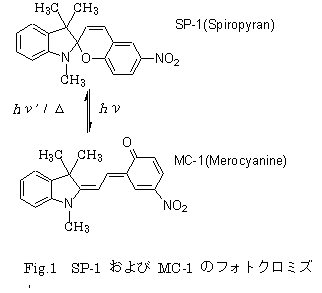 SP-1は,暗所では無色ですが,溶液にして紫外光を照射すると色をもったメロシアニン色素MC-1(Fig.1)に異性化します。MC-1は,可視光照射あるいは暗所で熱をかけることによってSP-1に戻ります。このような現象はフォトクロミズムとよばれ,光スイッチングや光メモリーなどといった情報記録材料への応用の可能性が考えられています。