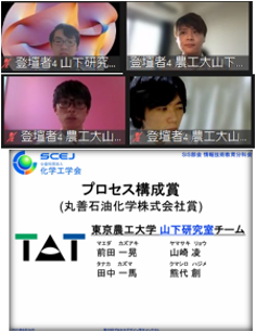 化学工学会 第20回プロセスデザイン学生コンテストにて発表 Sep 24, 2021 化学工学会 第20回プロセスデザイン学生コンテストに,前田、山﨑、田中、熊代がチームを組んで参加し,プロセスエンジニア賞他を受賞しました. 教授