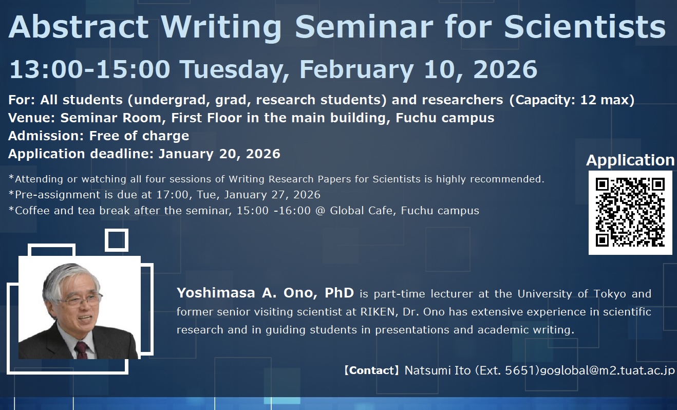 Abstract Writing Seminar for Scientists 〜2月10日13:00~15:00@府中本館1階セミナー室、使用言語:英語 申込みはコチラ(1/20締切)