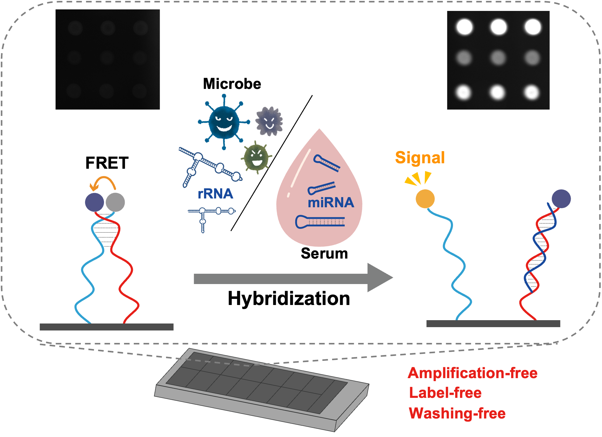 Pathogenic microorganisms, such as Escherichia coli and Staphylococcus aureus, must not contaminate food products, making microbiological testing crucial during the manufacturing process. Conventional methods are labor-intensive and time-consuming because they require culturing microorganisms for detection and identification. We have developed “signaling probe-based DNA microarrays”—a technology that utilizes DNA microarrays to detect gene sequences specific to pathogens. This system eliminates the need for gene amplification, fluorescent labeling, or washing steps required by conventional DNA microarrays, allowing simple, rapid and high-throughput testing (Figure 4).