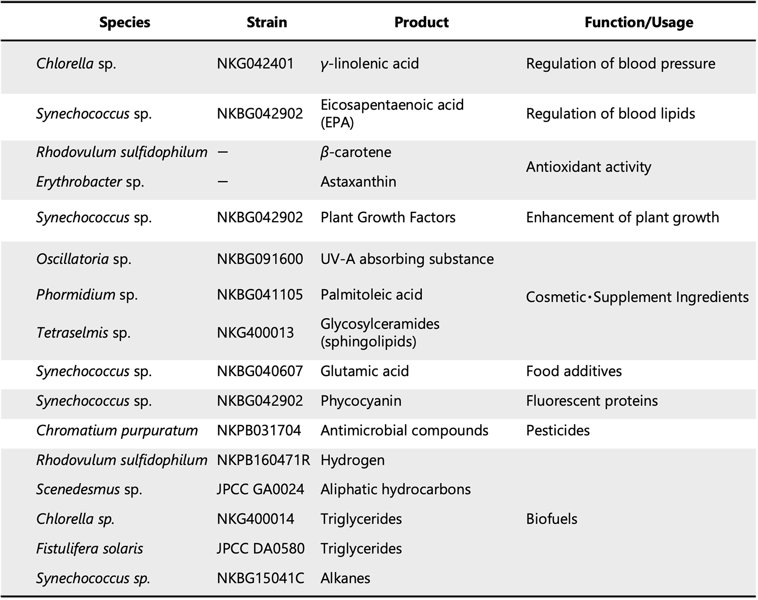 We maintain a culture collection comprising hundreds of species of microalgae and photosynthetic bacteria isolated from marine environments (Fig. 1). These strains produce a variety of valuable compounds, including bioactive and antioxidant carotenoids, antimicrobial substances, omega-3 fatty acids, biofuels, and cosmetic ingredients (Table 1).