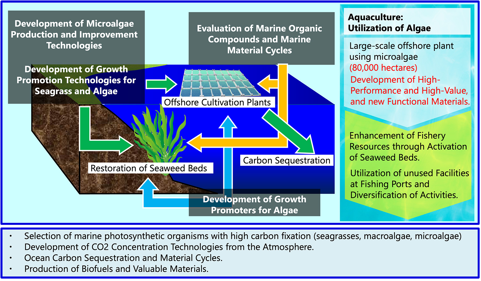 Our laboratory is particularly focused on marine microalgae, which have more than ten times the carbon fixation rate (absorption rate) compared to land plants. This makes them a promising candidate for applications in carbon sequestration in the ocean. We are conducting research aimed at establishing highly efficient carbon sequestration technologies using marine microalgae. Additionally, to realize carbon recycling through blue carbon, we are advancing multi-omics analysis of marine microalgae and developing genetic modification and genome editing techniques(Fig. 6). (https://www.jst.go.jp/pf/platform/)