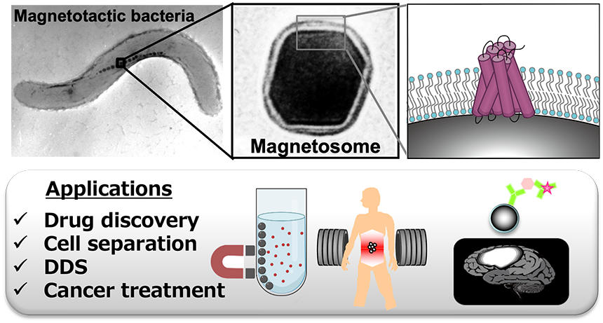 Magnetotactic bacteria are microorganisms capable of intracellularly synthesizing nanoscale magnetic particles called magnetosomes by incorporating iron ions from their environment. Magnetosomes are magnetite (Fe3O4) crystals enclosed in a lipid bilayer, characterized by their uniform size and morphology, high dispersibility in aqueous solutions, and excellent biocompatibility. These properties make magnetosomes superior to artificially produced nanomagnets. Consequently, magnetosomes have been applied in various fields, such as the development of highly sensitive immunoassays and their use as magnetic carriers in drug delivery systems.