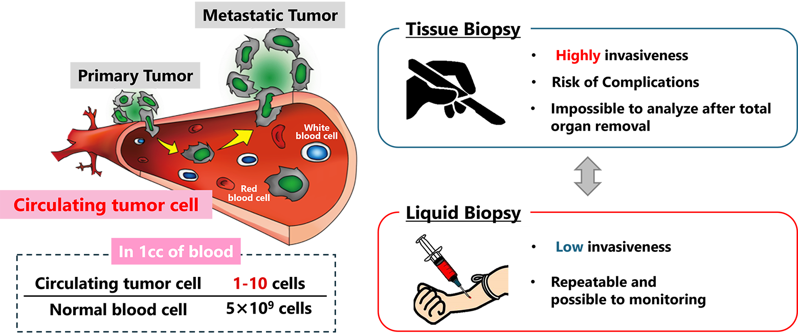 One of the key targets of liquid biopsy is circulating tumor cells (CTCs)—cells that break away from cancerous tissues, enter the bloodstream, travel throughout the body, and contribute to metastasis. CTCs are considered a promising biomarker, but they are extremely rare, with only 1 to 100 cells found among approximately 5 billion blood cells in a single milliliter of blood. This rarity underscores the need for advanced technologies capable of efficiently isolating and recovering CTCs from blood for detailed analysis.