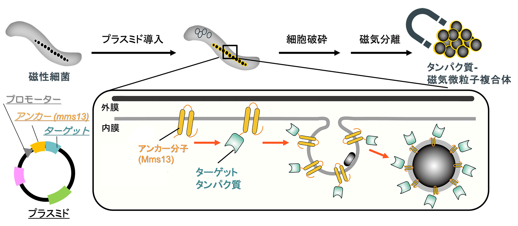 磁性細菌は、大腸菌等と同様に遺伝子組換え技術を用いることで外来タンパク質の生産宿主として利用することが可能です。磁性細菌を宿主として用いることの利点は、マグネトソーム表面へ外来タンパク質を提示 (ディスプレイ)できることです。