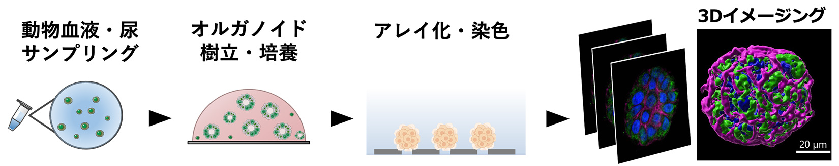 当研究室では、これまでに3Dイメージングを可能にする顕微鏡を用いて、MCAでアレイ化した細胞を単一細胞レベルで評価することに成功しました。現在、この技術をがんオルガノイドに応用し、単一オルガノイドレベルでの抗がん剤評価技術の確立を進めています。さらに、ヒトやイヌの血液や尿中に含まれる微量ながん細胞を対象に、MCA法を用いて細胞を濃縮し、その後、細胞外マトリックスで培養する一連のプラットフォームを構築しています。この技術を用いて、液体サンプルからがんオルガノイドを樹立し、そのオルガノイドを使った抗がん剤評価を行うことを目指しています。これが実現すれば、生体外で正確かつ迅速に患者に最適な治療薬の選択が可能となり、個別化医療に貢献できると考えています。